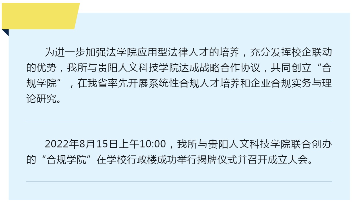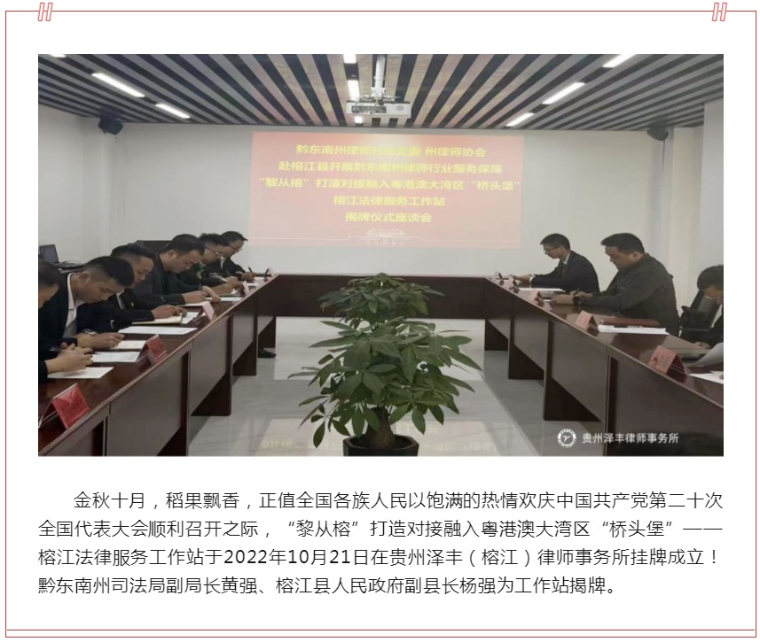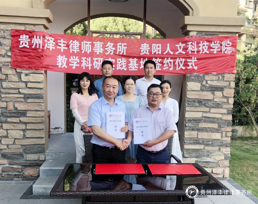 2022年7月8日,贵州泽丰律师事务所与贵阳人文科技学院法学院共建教学科研实习基地签约授牌仪式顺利举行。 贵州泽丰律师事务所主任、企业合规研究中心主任石利民,高级合伙人申鹏,高级