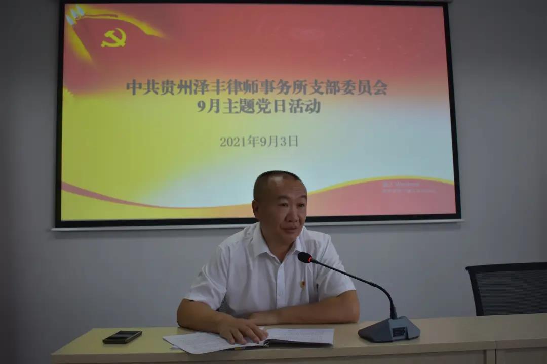 ?为深入开展党史学习教育,传承红色基因,弘扬时代精神,2021年9月3日下午,中共贵州泽丰律师事务所支部委员会9月主题党日活动在事务所多媒体会议室举行。党支部书记石利民作“深入学习贯彻习近平