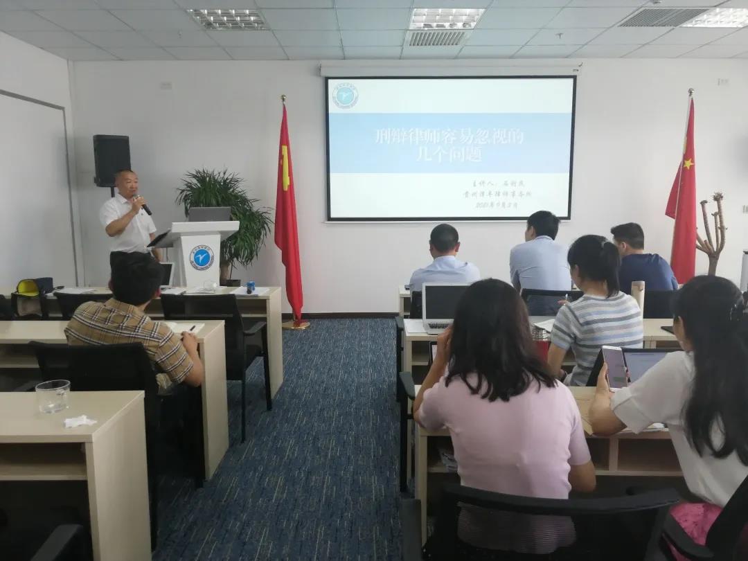 ???2021年9月3日下午,贵州泽丰律师事务所内部专题培训在事务所多媒体会议室举行。合伙人石军律师、事务所主任石利民分别作“新形势下青年律师代理工作的开拓与发展”、“刑