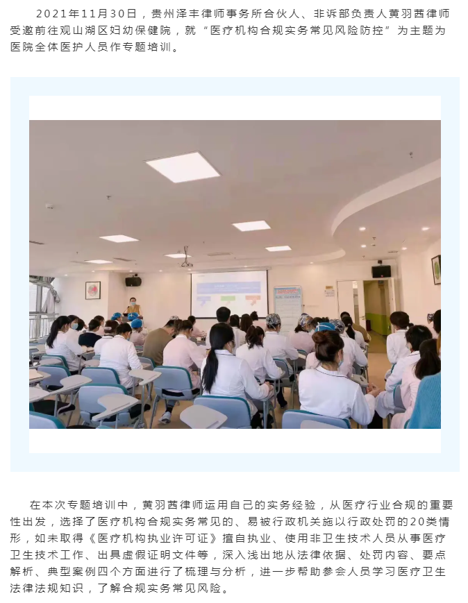 泽丰资讯|我所合伙人黄羽茜律师受邀为观山湖区妇幼保健院及观山湖区卫健局作专题培训讲座Claier-L?贵州泽丰律师事务所?2021-12-0115:08?