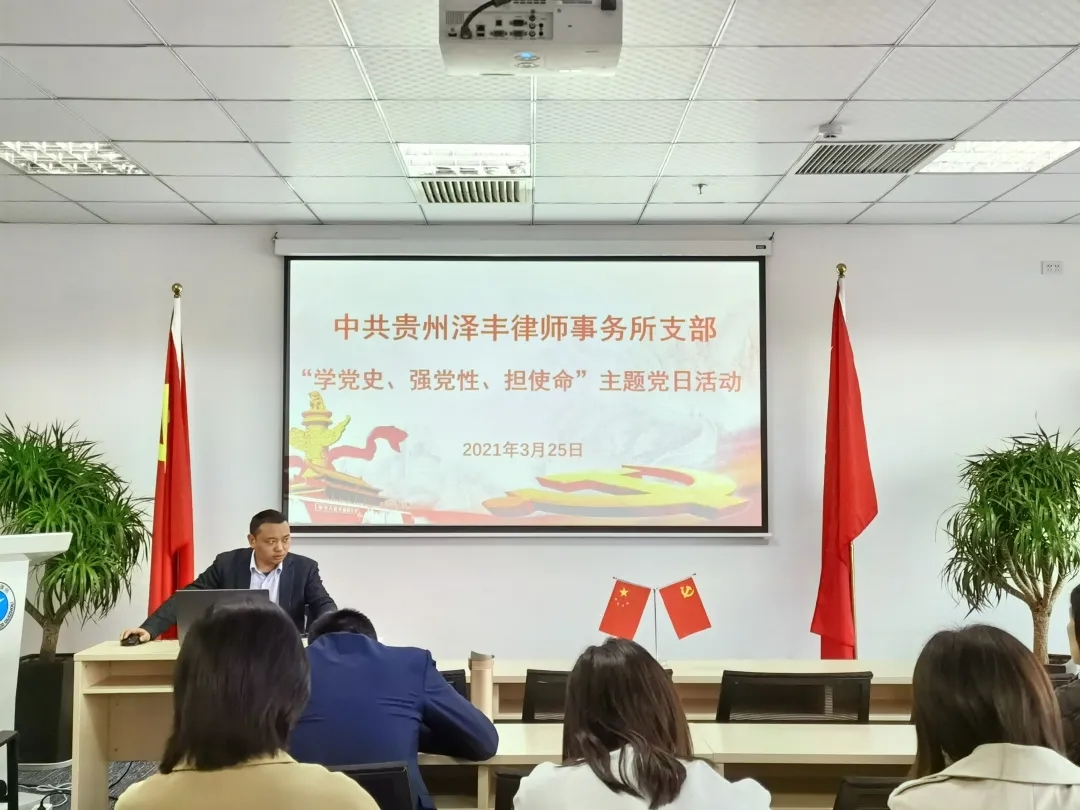 2021年3月25日下午,贵州泽丰律师事务所开展“学党史、强党性、担使命”主题活动。事务所高级合伙人、党支部纪检委员冯跃进作了“中国共产党1921-1949二十八年历程——伟大的信仰与精神力量夺取的艰
