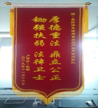 2019年11月18日上午,贵州省贵阳市返还原物纠纷当事人卢女士一家将写有“厚德重法?鼎力正义?锄强扶弱?法律卫士”的锦旗送到我所,并向我所高级合伙人严良芹律师团队成员表